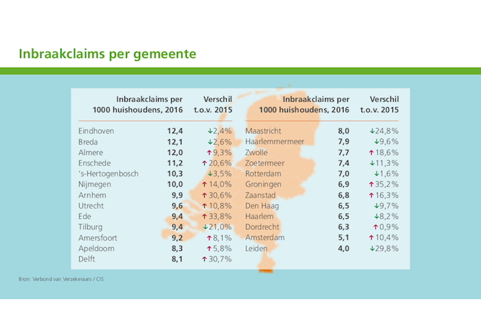 … de gemeenten Eindhoven, Breda en Almere. Huis gekocht in één van deze gemeenten? Dan is de kans op inbraak relatief gezien groter dan de rest van Nederland. Dit zijn de meest recente cijfers: