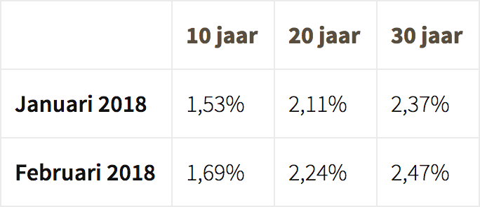 Vorige week stegen de rentes voor zowel 10, 20 als 30 jaar vast allemaal in één week. Daarmee lijkt een einde te komen aan het tijdperk van de extreem lage rentes. Hieronder zie je de hypotheekrentes op 1 januari 2018 en de rentes van dit moment: