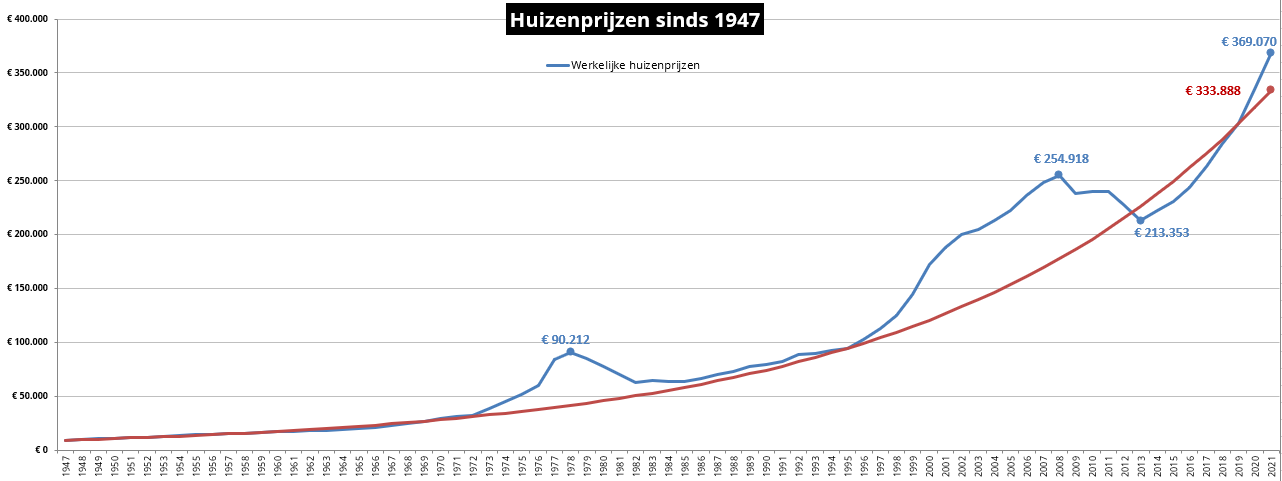 Om een verwachting over de huizenmarkt in 2022 uit te spreken, hebben we ook gekeken naar de gemiddelde huizenprijzen van 1947 tot nu. Een huis kostte toen gemiddeld 9.199 euro, inmiddels is dat opgelopen tot 369.070 euro. Dat lijkt op een gigantische stijging, maar komt neer op een gemiddelde prijsstijging van 5,3% per jaar.