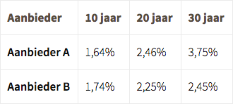Wij werken met een uniek systeem waarin de producten en hypotheekrentes van alle aanbieders staan. Waarom is dit zo belangrijk? Per aanbieder kunnen de rentes per rentevaste periode verschillen. Kijk maar naar het voorbeeld hieronder: